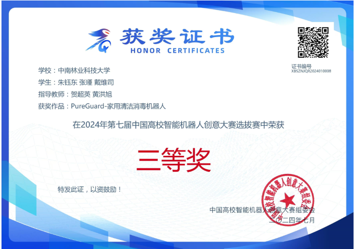 2024年第七届中国高校智能机器人创意大赛采用区域赛和全国赛二级赛制,我校参赛队员朱钰东、张瑾、戴维司在自动化系贺超英、黄洪旭两位教师的指导下,于今年七月在福建、广东、湖南、陕西、上海、天津、新疆、云南等省市联合区域赛中获得主题一无实物组三等奖。