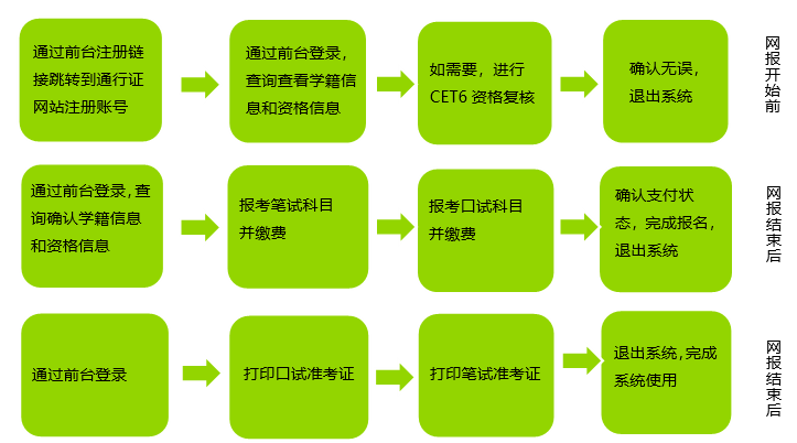 n  CET笔试考试进行前的所有操作都在本系统进行,包括报名、缴费、打印准考证。
